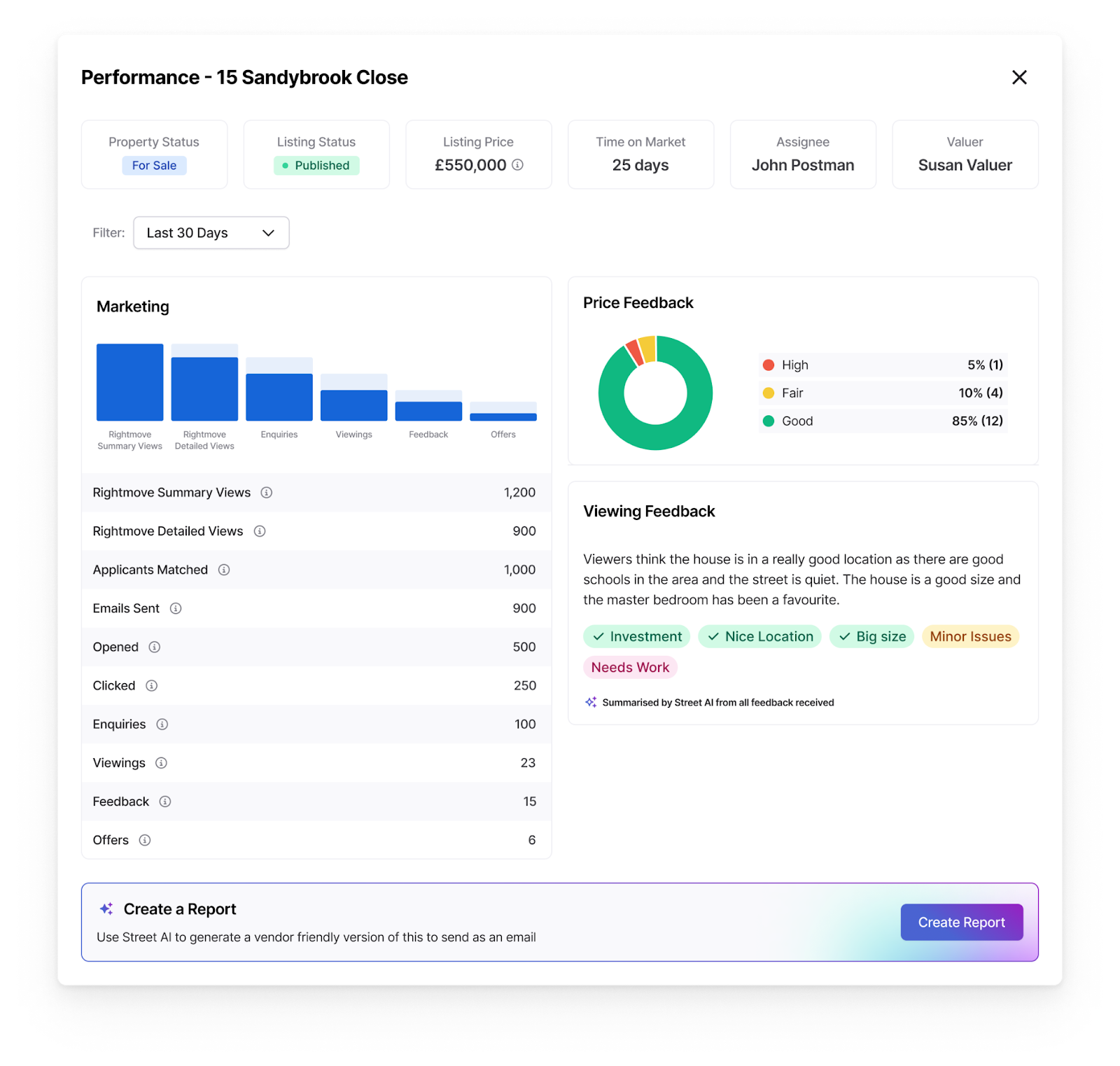 Street.co.uk’s listing performance reports collate and summarise all submitted feedback from viewers in seconds – saving you hours of time, and reassuring your vendors that you’re as invested in the sale of their property as they are.